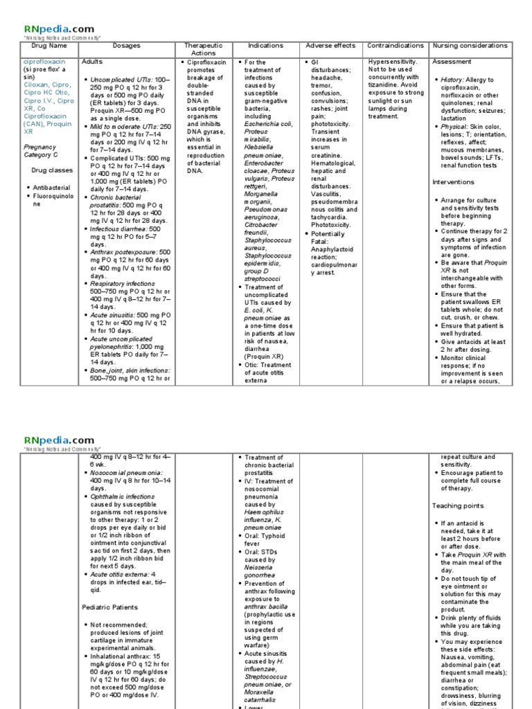 Medication Sheet Cipro ACTIVE LEARNING TEMPLATES THERAPEUTIC